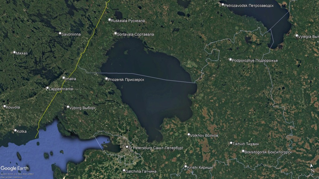 Looking closer at former Leningrad, you can see St. Petersburg on the southwestern side of Lake Ladoga. A little more ancillary detail about the wartime conditions around Lake Ladoga is that on the northeastern side of the lake, it was significantly forested, and this had a strategic effect on the war which I admit I’m not familiar with, but I imagine that both mechanized warfare and infantry combat in the forest were not optimum conditions for the Russians or the Germans.